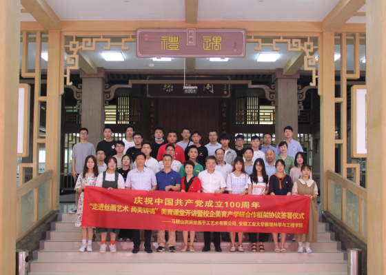 数理科学与工程学院与马鞍山市洪滨丝画手工艺术有限公司校企美育产学研合作框架协议签署仪式在马鞍山中国丝画院隆重举行。马鞍山市人大常委会副秘书长曹化根,中国工艺美术大师、洪滨丝画手工艺术有限公司总经理袁洪滨,车间主任曹业翠、总经理助理黄静芳,数理学院领导班子以及光电系师生代表参加签约仪式。