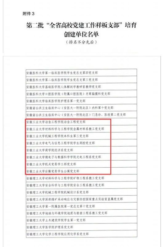 自教育部和安徽省实施新时代高校党建示范创建和质量创优工作以来,学院先后入选“全国党建工作样板支部”1个,省级“样板支部”2个。