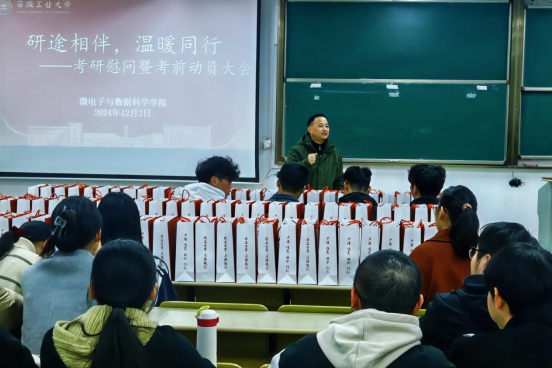 为增强考研学子的备考信心,缓解备考压力,12月2日下午,微数学院在数理楼403举办了考研慰问暨考前动员大会,向正在紧张复习备考的学子们送去温暖与祝福。院党委书记汪春胜,院党委副书记、纪委书记、副院长张敏,毕业生辅导员张佳良、周文潇参加了本次活动。活动由张敏主持。