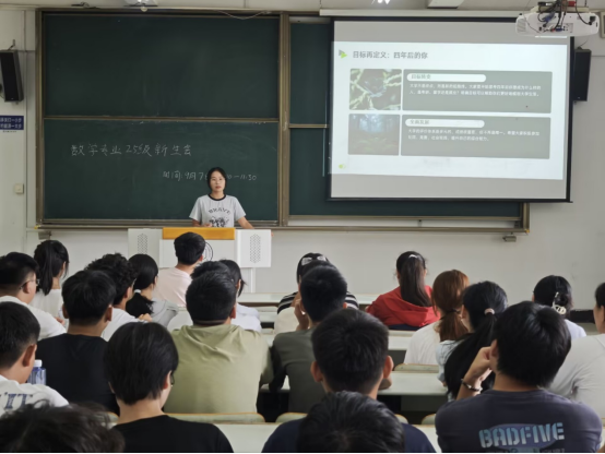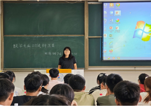 数学与应用数学专业2025级新生见面会在东教304教室举行。系党支部书记谷勤勤老师,新生班主任王石老师和张敏敏老师,班级助理王武和胡磊,以及全体新生共同参与。