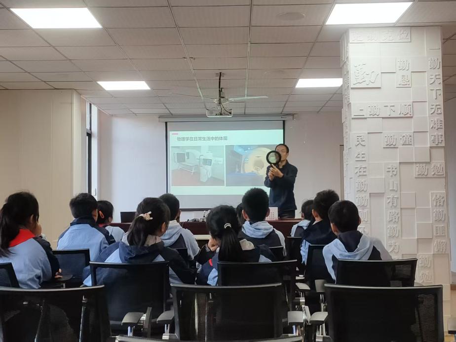 活动伊始,韩老师以“物理学与日常生活”为主题开启科普讲解。他巧妙结合同学们熟悉的衣食住行场景,用通俗生动的语言解读物理学原理的具体应用,将抽象的公式与概念转化为直观可感的生活实例,让原本枯燥的知识变得鲜活有趣,同学们听得聚精会神,不时发出恍然大悟的感叹。