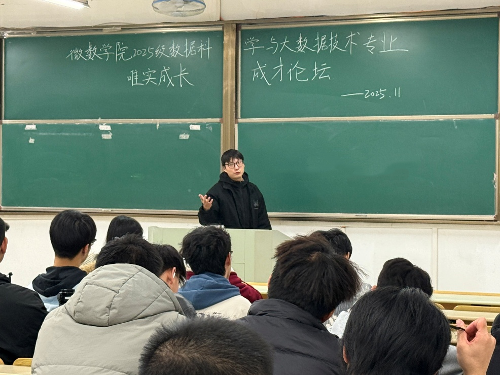 为充分发挥优秀学长学姐的榜样引领作用,帮助2025级大一新生明晰成长方向、破解适应难题,11月30日,微数学院关工委联合学生工作办公室举办“唯实”学生成长成才论坛(第七期)。本次论坛邀请2022级数据科学与大数据技术专业优秀学子祖昂、赵泽洋担任主讲人,2025级大数据专业新生全程参与,辅导员周文潇主持。